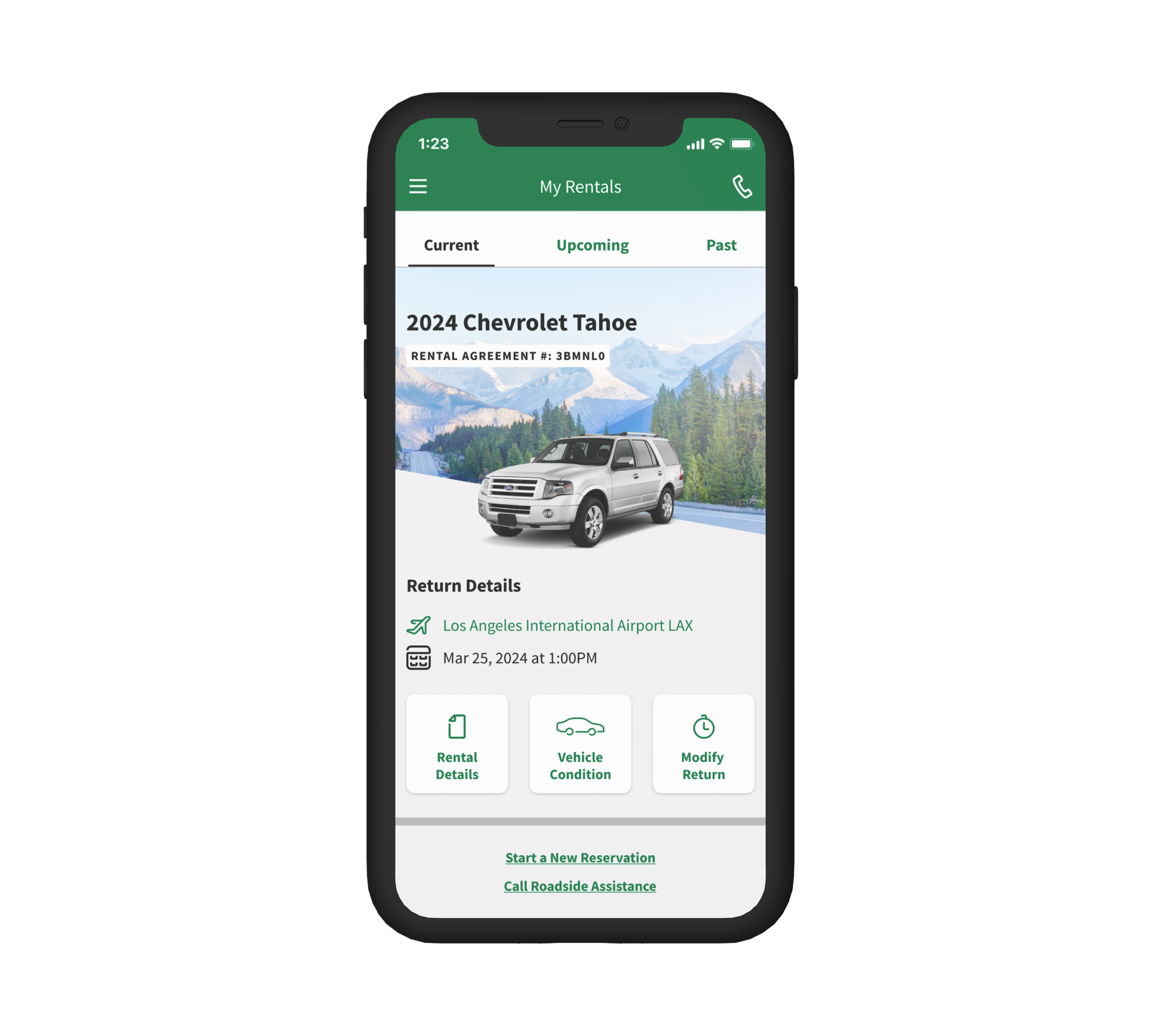• Links or entry points to Rental Details, Vehicle Condition Report, and Modify Return