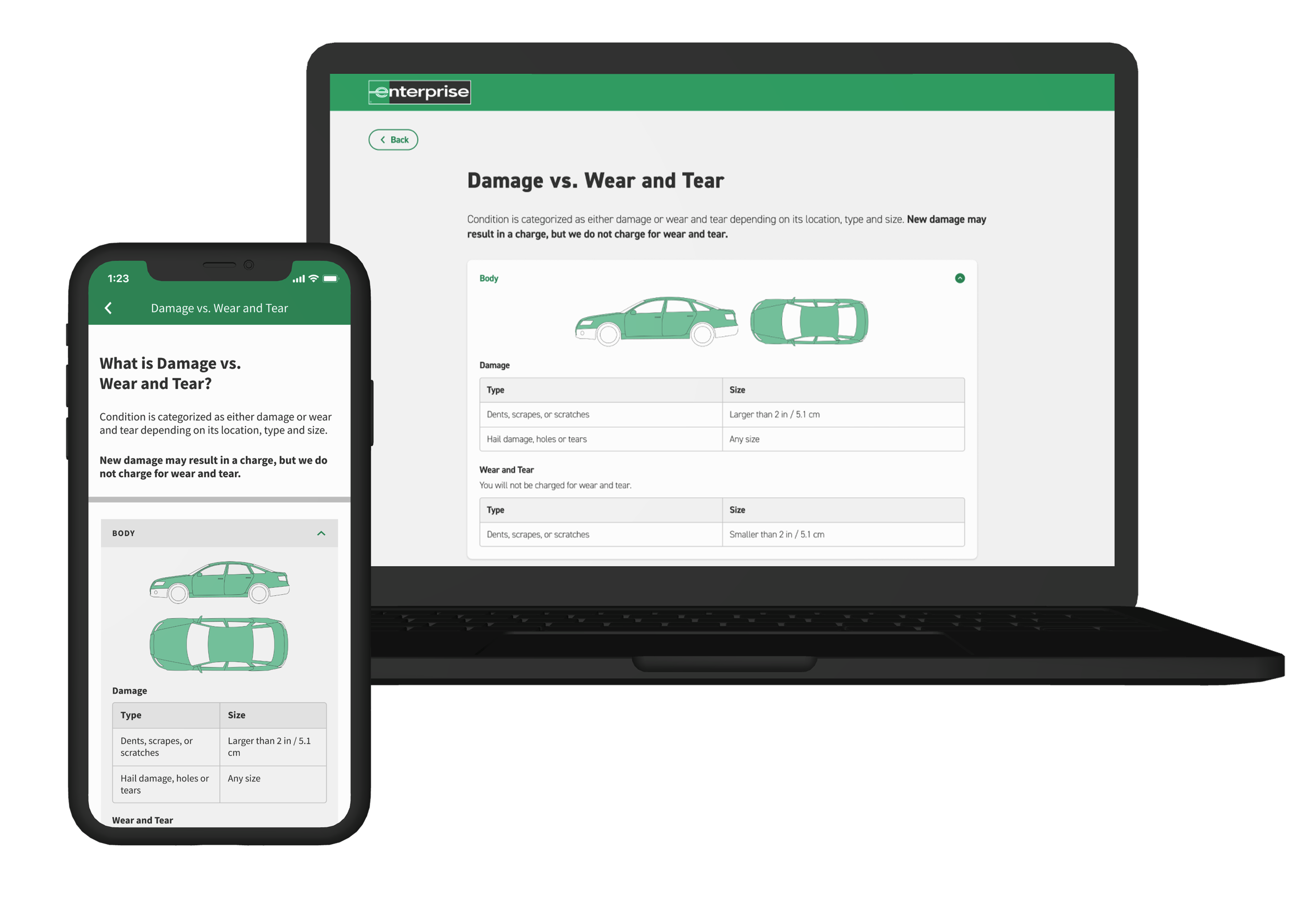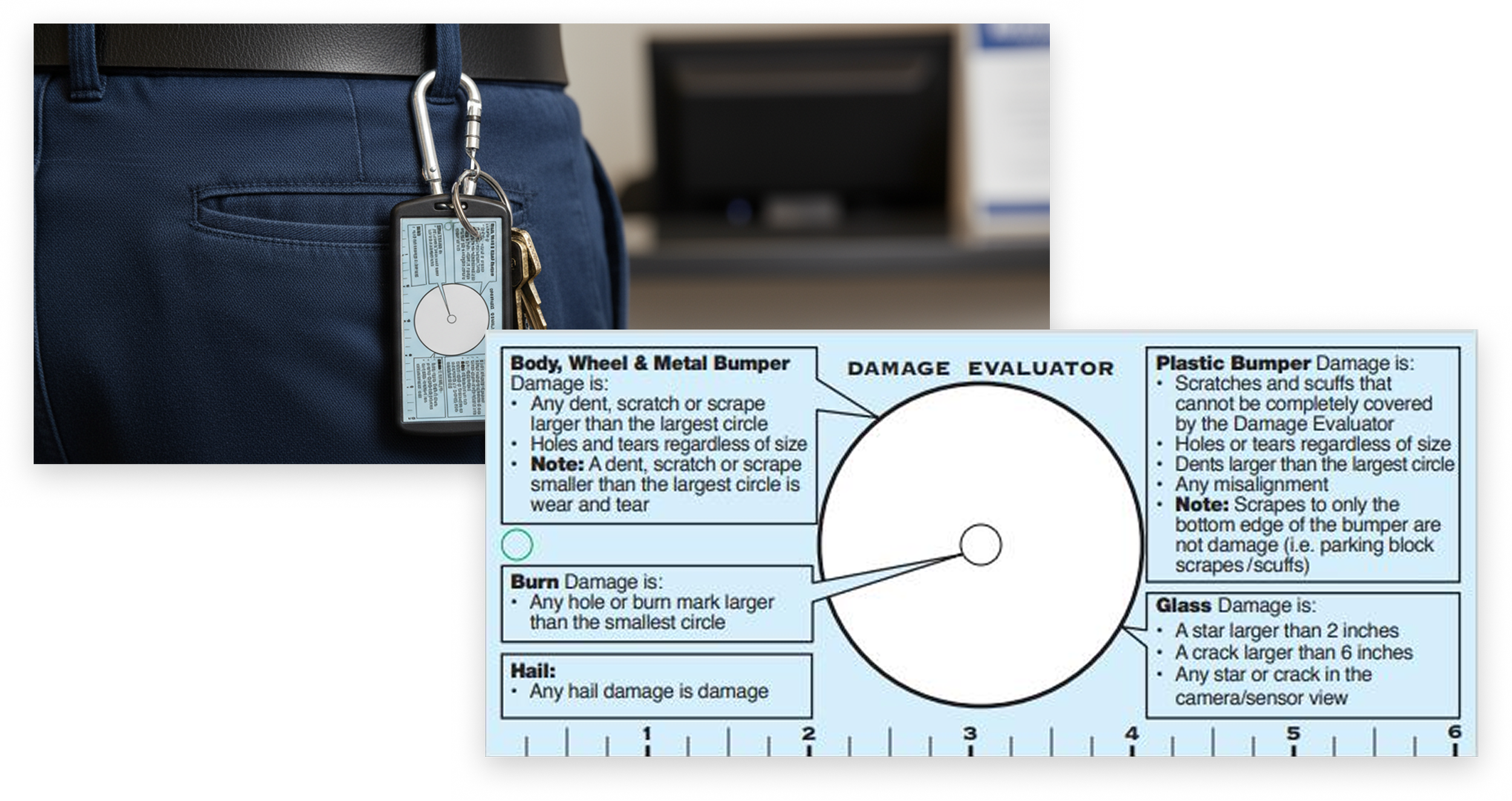 Previously, Enterprise employees would carry a Damage Evaluator, or laminated card which they would use to measure and evaluate what is considered as damage vs. normal wear & tear.