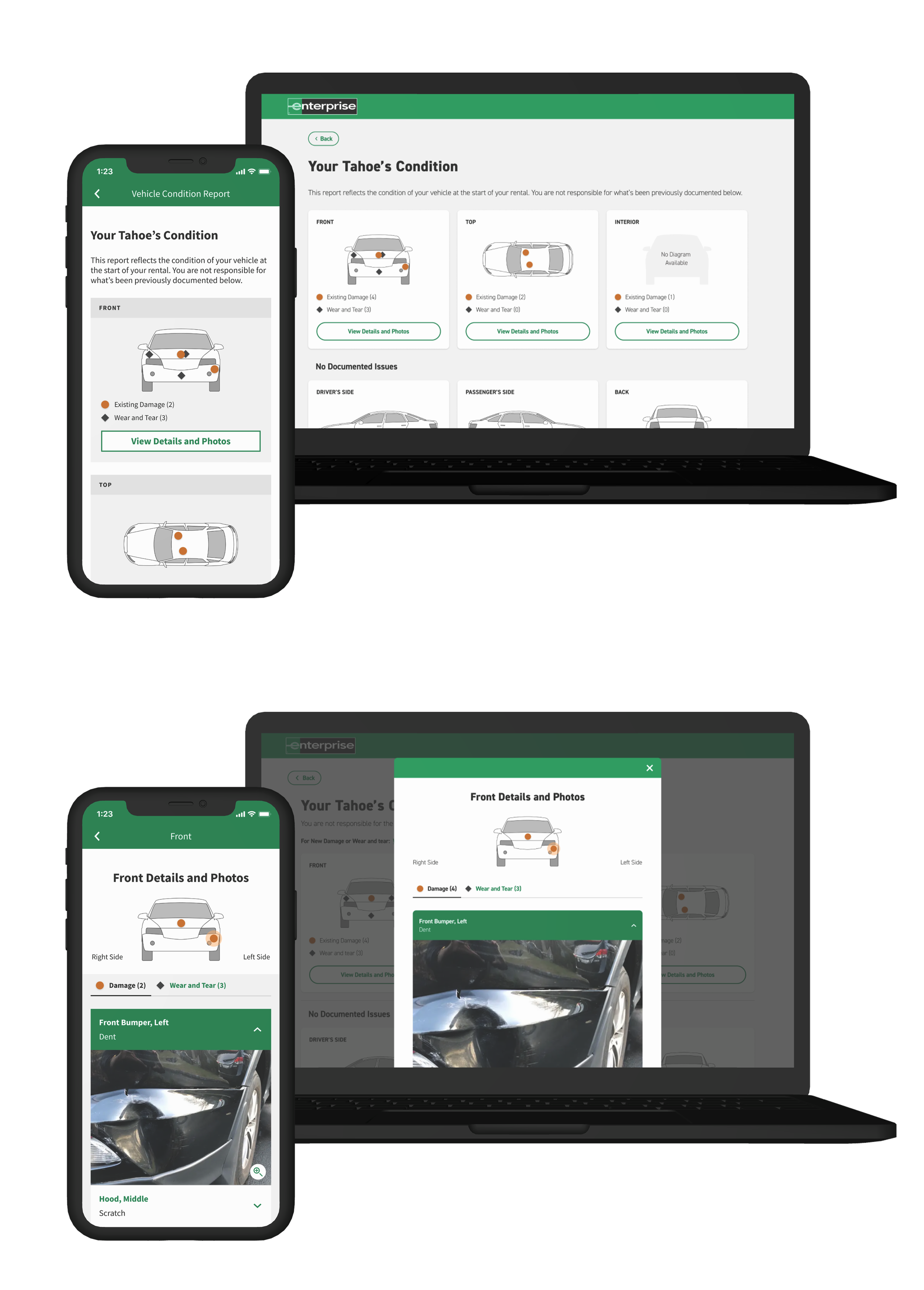 Designed an interactive vehicle condition report that provides customers with comprehensive diagrams, descriptions, and photographs of their rental vehicle, enabling clear understanding of its pre-existing condition. The goals of the vehicle condition reporting initiative are to: