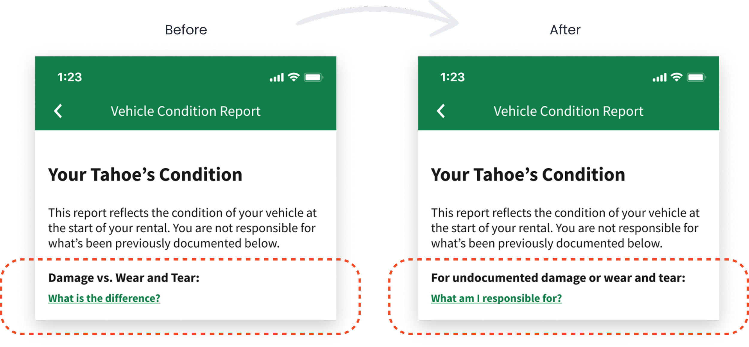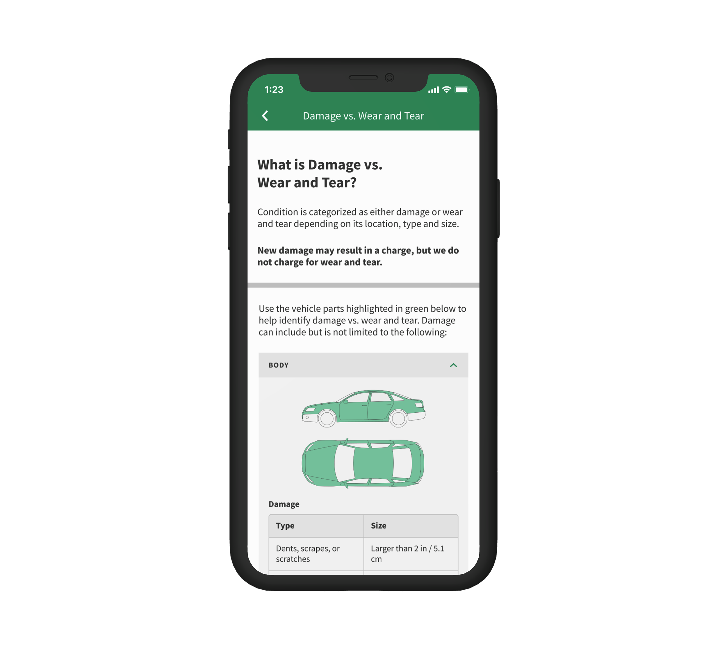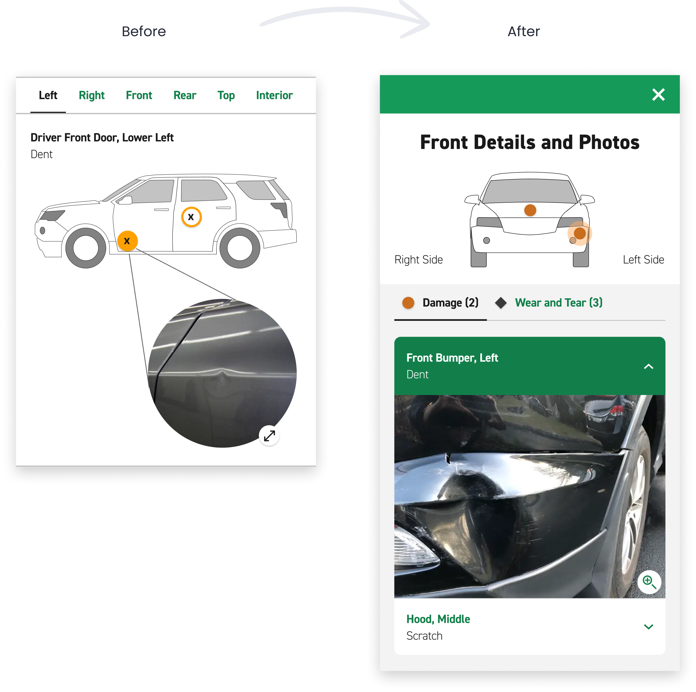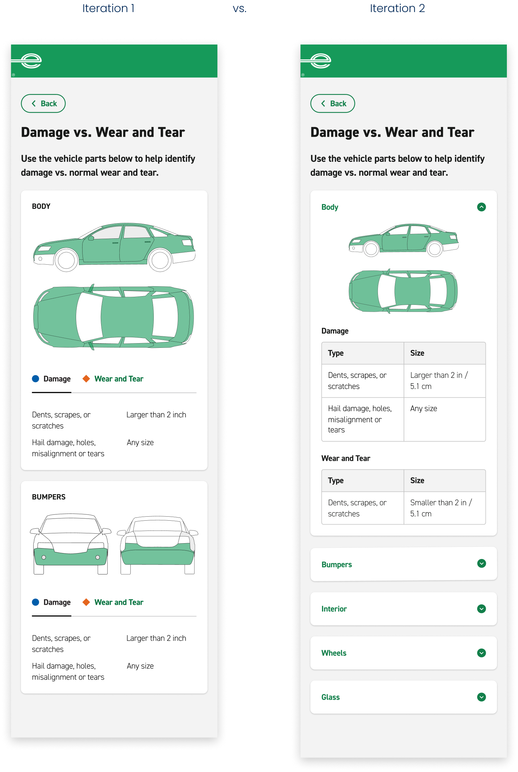Because the distinction between damage and normal wear and tear depends on the size, type, and location of the issue on the vehicle, I needed to clearly define these nuances for customers. I addressed this by using progressive disclosure, schematic diagrams, and tabular comparisons to support quick comprehension.