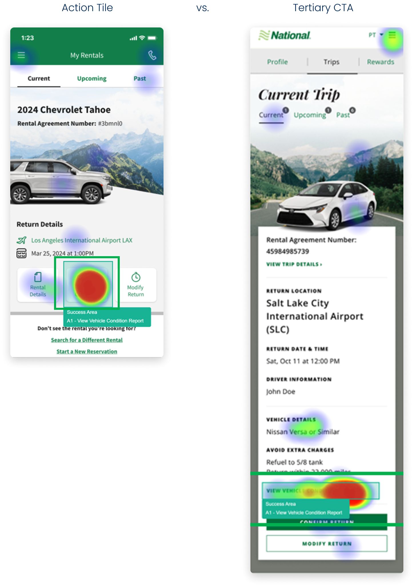 Customers found the Vehicle Condition button in 6 seconds with a 86% success rate for action tiles vs. 9 seconds with a 77% success rate for tertiary CTA.