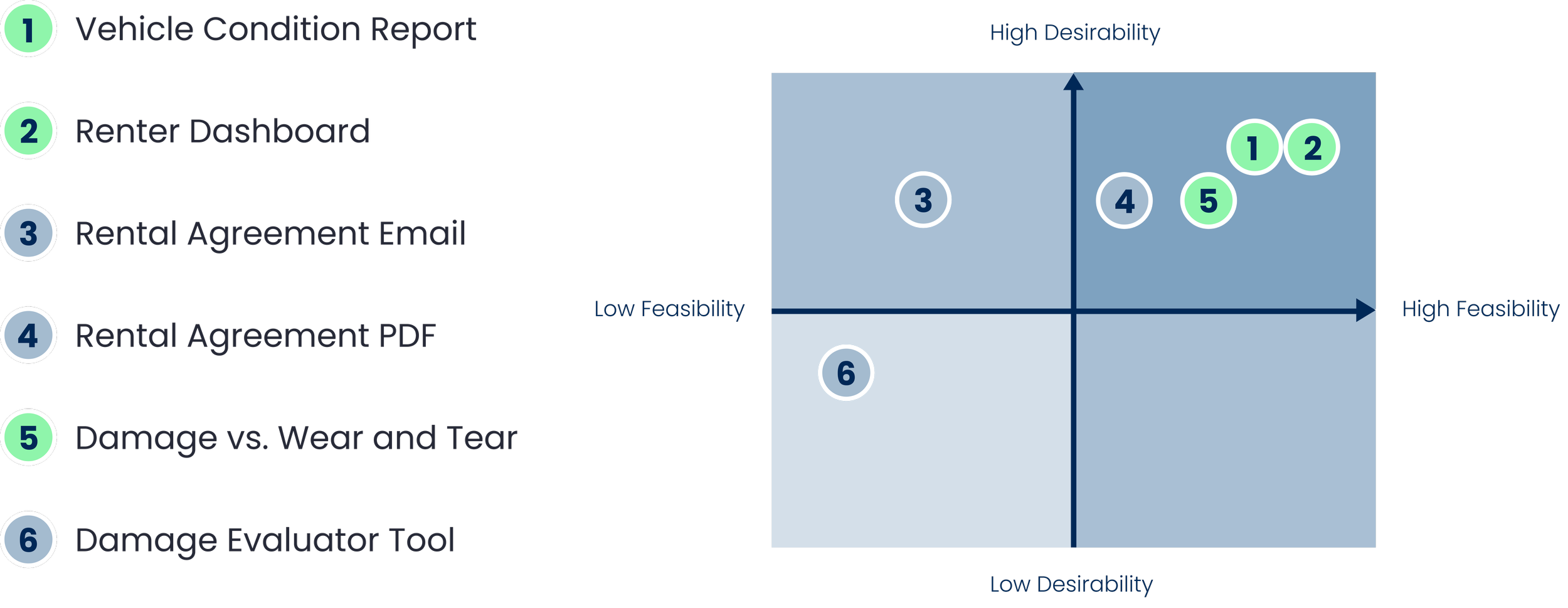 We prioritized the ideated features based on feasibility and desirability. The three features prioritized for MVP include a Vehicle Condition Report, a Renter Dashboard, and a Damage vs. Wear and Tear Informational.