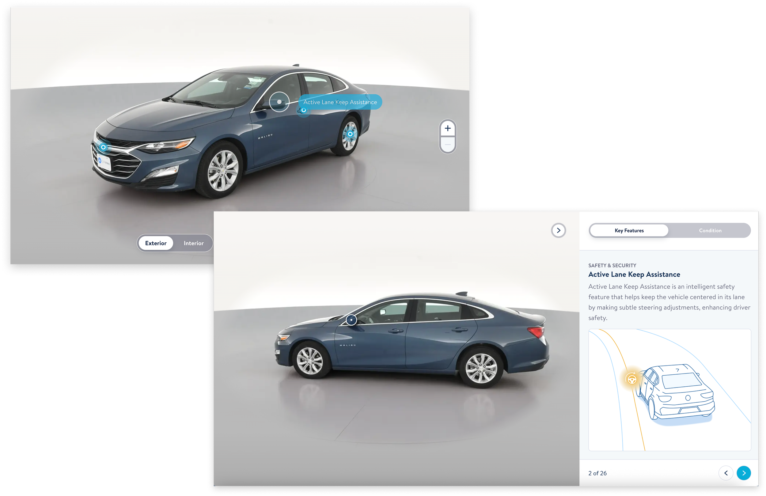 Carvana provides a highly interactive 360 degree view of each vehicle. Key features are highlighted by pins, and upon click/tap, a drawer reveals a detailed description.